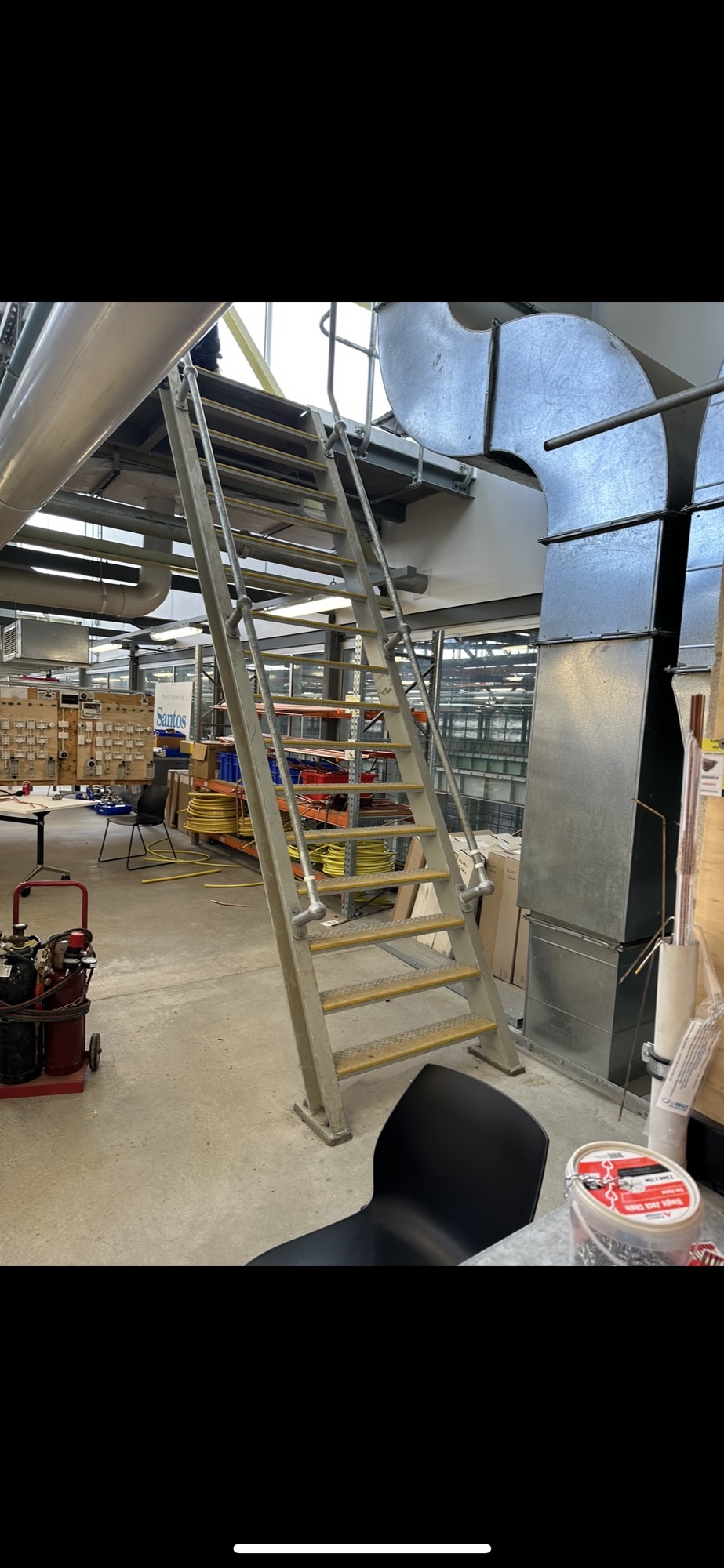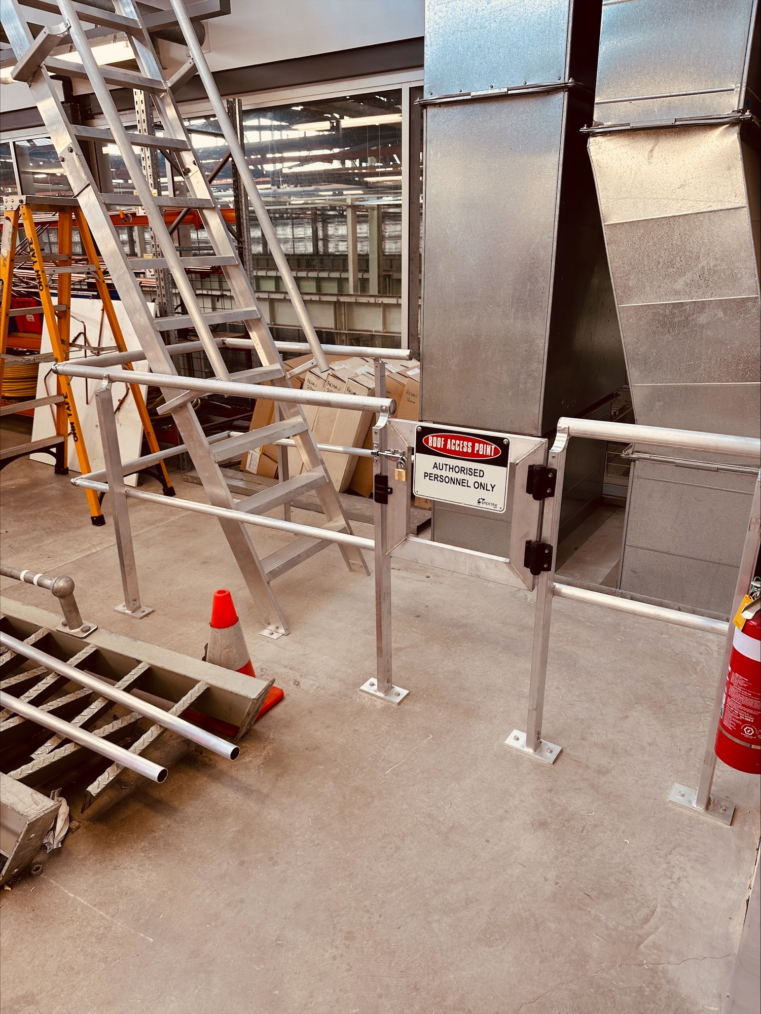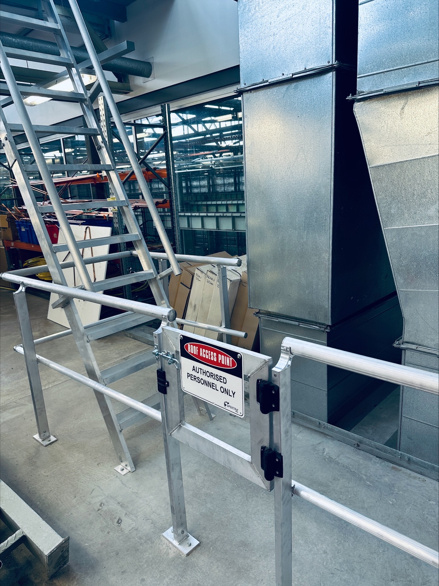 The existing internal stair system used for roof access inside the Tonsley TAFE workshop was found to be non-compliant and unsafe for routine maintenance access. The client required a fully compliant roof access system to ensure safe roof access with integrated guardrails and a controlled access point.